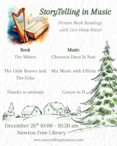 @Hunnerman Hall - Brookline Village 4:00 - 4:30 pmOn a cold winter day, come join us for picture-book readings accompanied by the soothing sounds of the harp, where imagination takes flight and meaningful connections blossom among us.