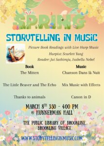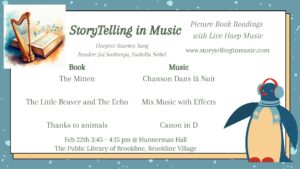 @Hunnerman Hall - Brookline Village 3:45 - 4:15 pm(Cancelled due to the blizzard. We will reschedule). On a cold winter day, come join us for picture-book readings accompanied by the soothing sounds of the harp, where imagination takes flight and meaningful connections blossom among us.